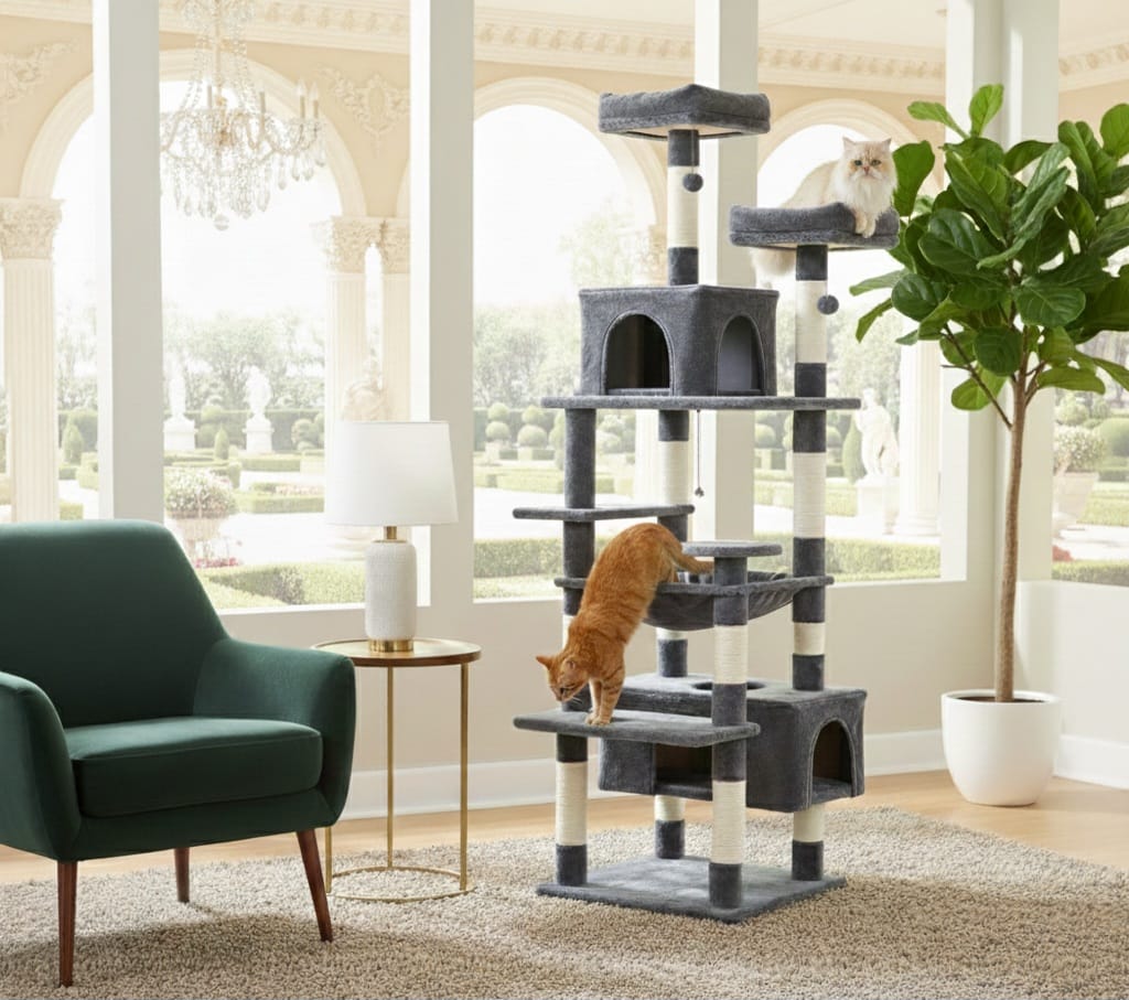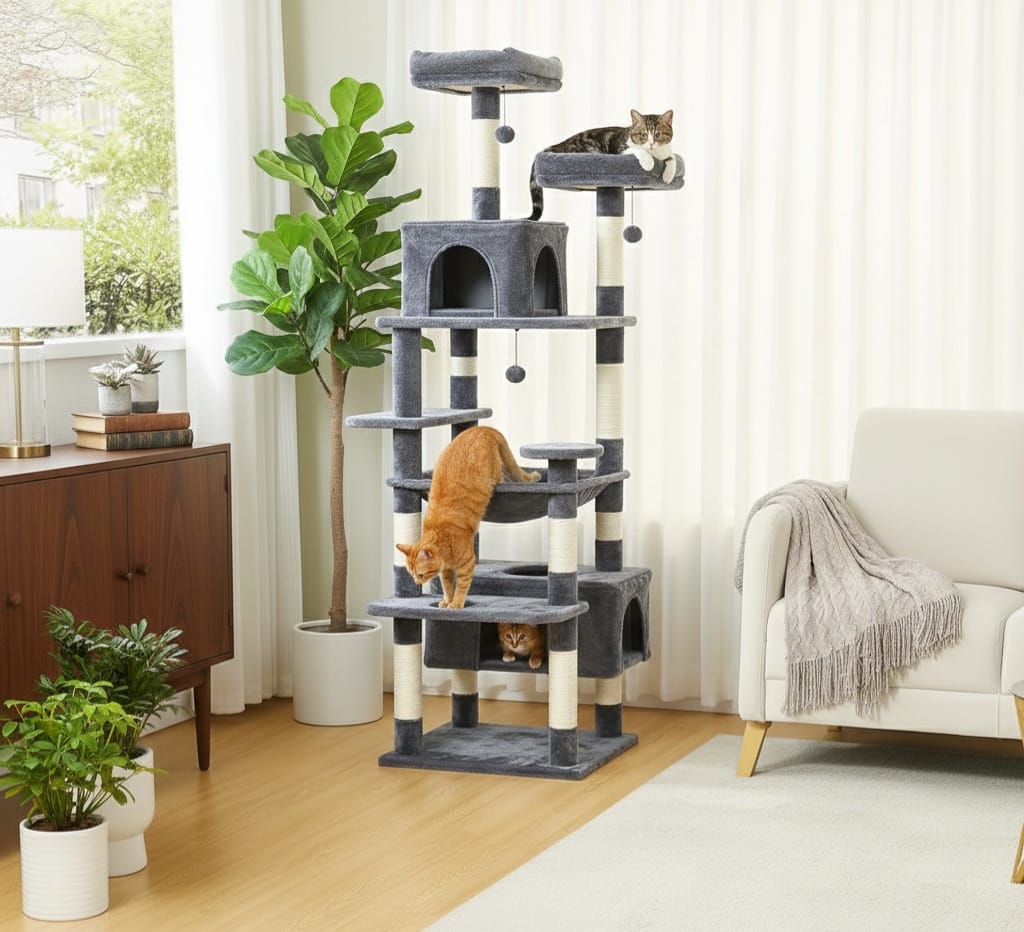 Entscheiden Sie sich für uns für Ihre Wohnungskatzen, denn unser großer Katzenbaum vereint Langlebigkeit, Sicherheit und Komfort mit einem ansprechenden Design, das den natürlichen Instinkten Ihrer Katze gerecht wird. Hergestellt aus hochwertigen, umweltfreundlichen Materialien, bietet er mehrere Ebenen, gemütliche Verstecke und stabile Kratzstämme, damit Ihre Katzen aktiv, unterhalten und stressfrei bleiben. Unsere Konstruktionen legen Wert auf Stabilität, um ein Umkippen zu verhindern, während weiche Oberflächen und durchdacht dimensionierte Plattformen dafür sorgen, dass Katzen jeden Alters sicher klettern, entspannen und spielen können. Mit Blick auf Funktionalität und Stil verschönern unsere Katzenbäume Ihr Zuhause und bieten Ihren Samtpfoten den ultimativen Spielplatz.